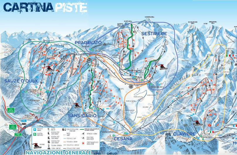 Many surface lifts and cable ways are available here to bring you again towards the fascinations of Plan del Sole (the Sun Valley), the Pian della Roccia, and the new Sportinia, up to Triplex (2507m), the Rocce Nere and the crest of Col Basset. From all these locations you can reach the valley and the Borgata Sestriere in some different ways, all full of fun!!!